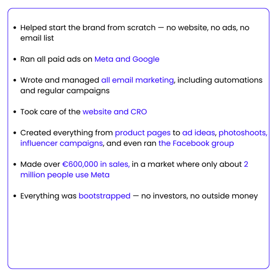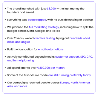 In the last 2 years Donatas played a key role in scaling our marketing budget from $3K total budget to six-figure monthly campaigns. He expertly managed Meta and Google Ads while contributing critical insights to broader marketing decisions. His dedication and results-driven focus significantly impacted our success. Highly recommended.